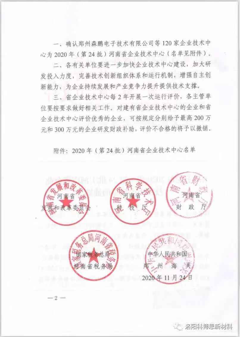 近日,河南省發(fā)展和改革委員會下發(fā)了《關(guān)于發(fā)布2020年(第24批)河南省企業(yè)技術(shù)中心名單的通知》(豫發(fā)改高技〔2020〕919號),經(jīng)過評審、考察、公示等環(huán)節(jié),洛陽科博思新材料科技有限公司從全省多家企業(yè)脫穎而出,順利通過第24批省級企業(yè)技術(shù)中心認定,這是公司在2018年被認定為洛陽市企業(yè)技術(shù)中心后的又一突破。